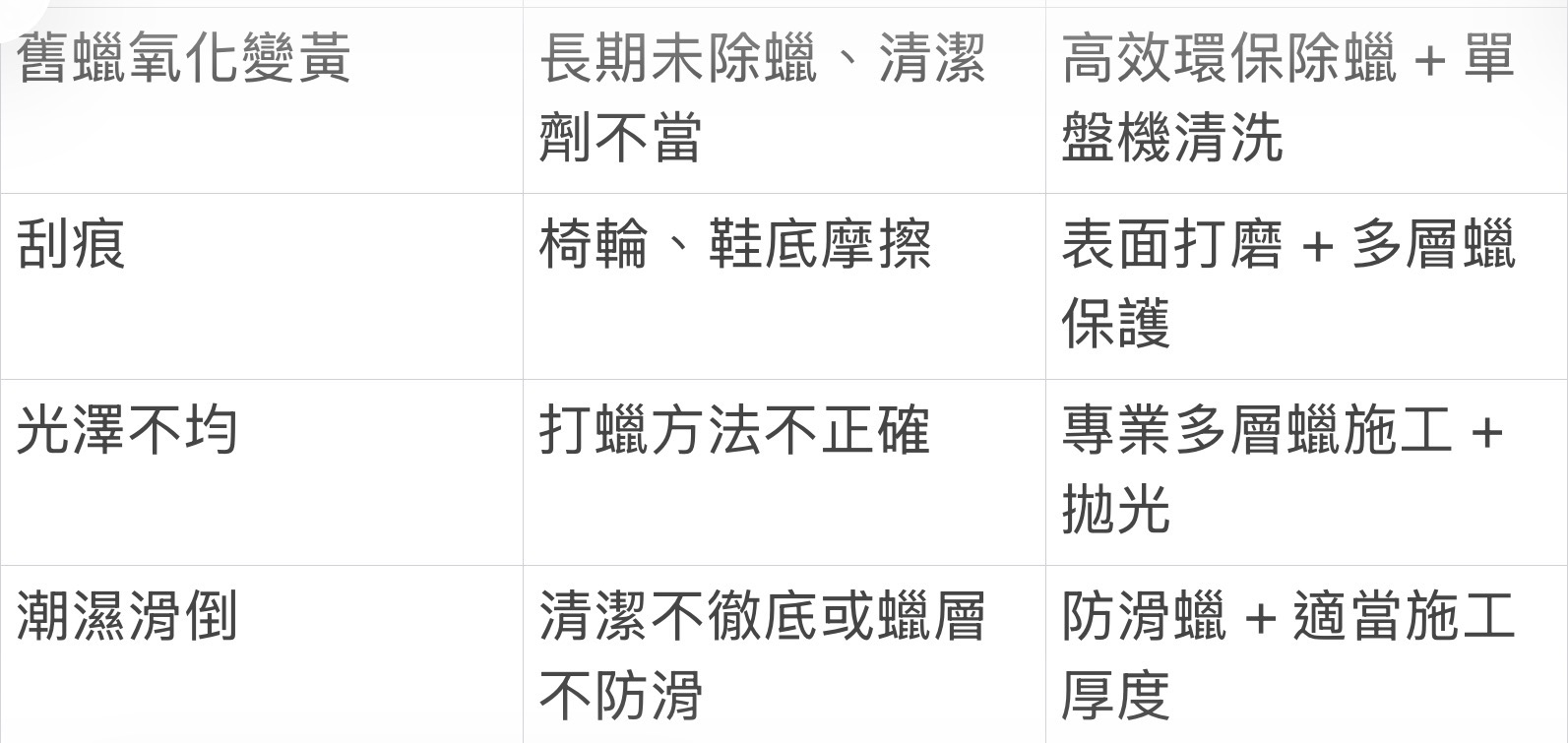拋光與防護.多層亮光拋光.防滑蠟施工,兼顧美觀與安全.針對高流量區域可加厚蠟層